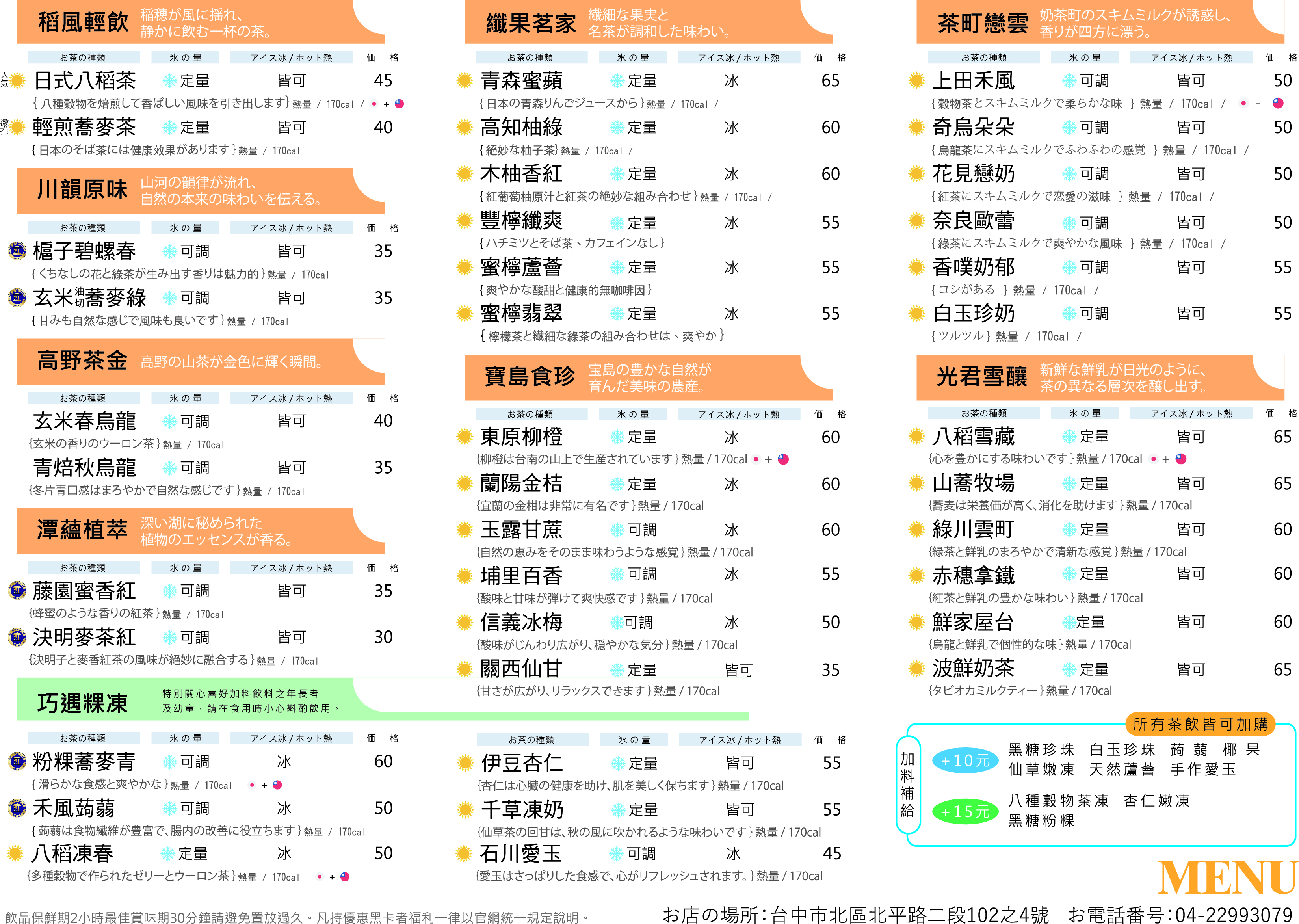「八稻」是一家融合台日茶飲技術,並將傳統與現代茶飲風格重新創作的精緻手作茶店。 採用台灣原產地頂級高山茶葉,並結合現代穀物焙煎的製茶技術,讓每一杯茶飲充分表現出茶葉原本香氣和獨特口感。 八稻的飲品豐富多樣,杯杯皆是經典,並由專業的茶葉品評師精心調製,從經典現泡茶、清新果茶到綿密奶茶、特色茶拿鐵,每一款茶品都經過多次測試調配,嚴格追求極致的高標準,就是為了滿足不同顧客的味蕾需求。 茶飲的健康屬性,堅持不添加人工香料,並選用優質的天然配料,讓消費者在享受美味飲品的同時,也能感受最佳的體驗。